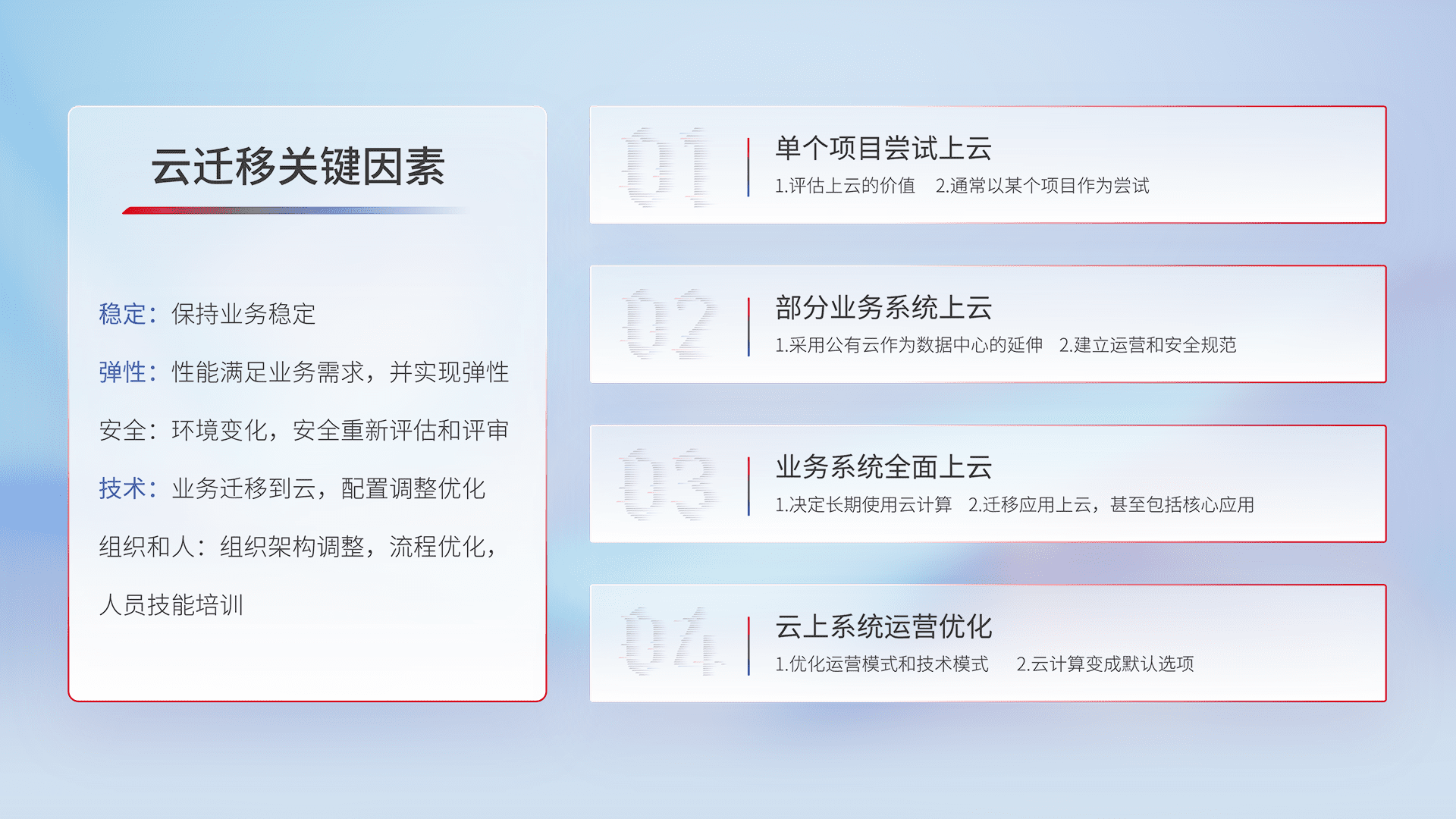 结合实际业务,,,从规划设计、、云平台选型、、云原生改造、、、、数据迁移、、、集成交付,,迁移全过程为客户识别最佳上云路径,,做好风险识别管理,,设计网络架构、、、身份权限、、、、安全审计合规、、、操作审计、、、日志审计、、监控告警策略、、、多站点容灾设计等,,对云上基础设施进行整体规划,,提升IT治理水平,,,以满足弹性、、高可用、、高性能的需求。。。