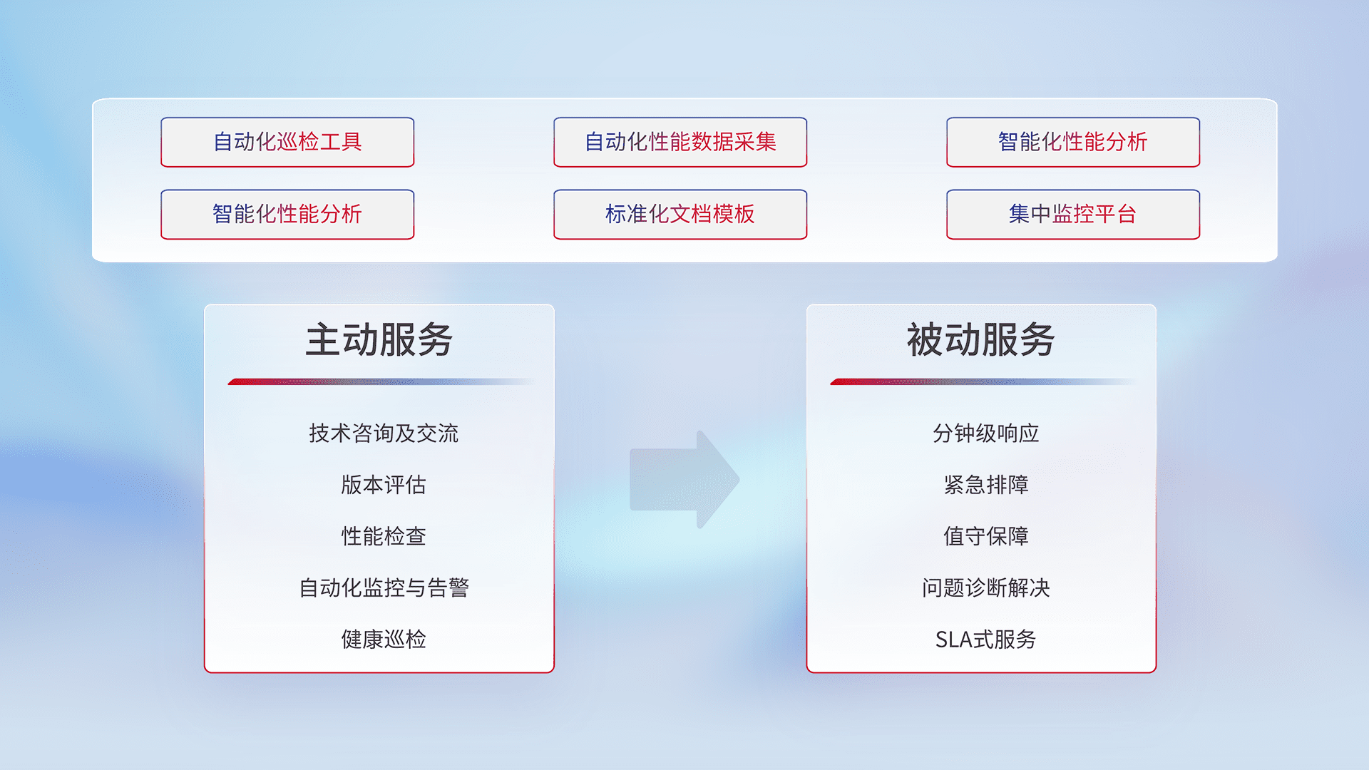 智能化工具和标准化文档,,,保障服务质量,,,,提供主动服务(包含技术咨询、、、、版本评估、、、、性能检查、、、自动化监控与告警、、、、健康巡检)和被动服务包含(分钟级响应、、、紧急排障、、、、值守保障、、问题诊断解决、、SLA服务)。。。